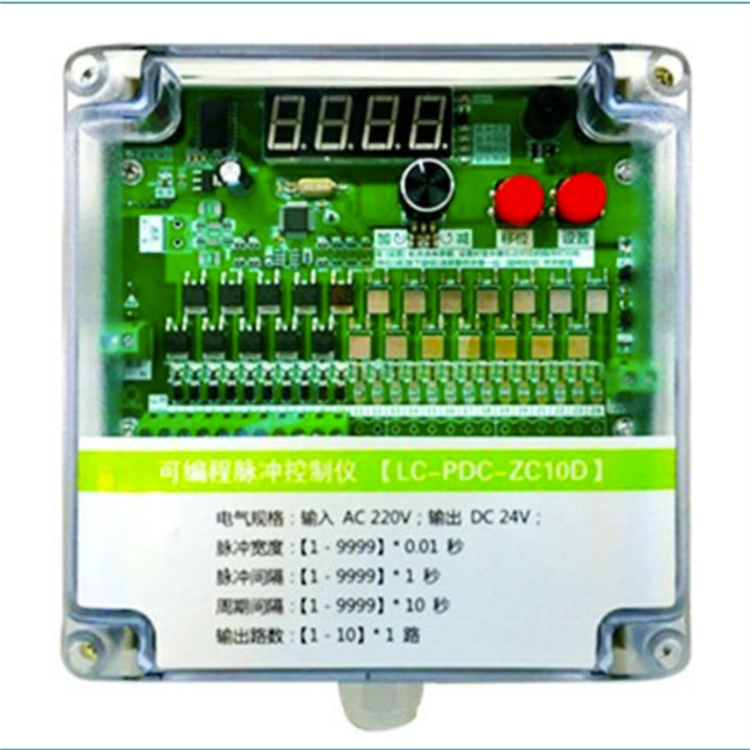 脈沖控制儀上電后默認提升閥關閉時間是5秒,噴吹時間是0.2秒,提升閥延遲復位時間5S,每個氣室間隔時間是60秒,如需調整,上電后10S內可直接設置,第一數碼管顯示O為調整多少室循環(huán),按“ZJ”鍵增加室數,(1室—20室循環(huán)可調),設置好后再按一下“GN”鍵,第一數碼管顯示1為各室間隔時間,按“ZJ”鍵加時間,,單位是1秒(1s—999s循環(huán)可調),設置好后再按一下“GN”鍵,第一數碼管顯示2為提升閥工作時間,按“ZJ”鍵增加時間,單位是1秒(1S—30S循環(huán)可調),完成后再按一下“GN”鍵,第一數碼顯示3為噴吹時間,按“ZJ”鍵增加時間,單位是0.1秒(0.1S—5S循環(huán)可調),完成后再按一下“GN”鍵,第一數碼管顯示4為延遲多長時間提升閥復位,按“ZJ”鍵增加時間,單位是1秒(1S—30S循環(huán)可調),完成后停10S本機將自動運行。第一數碼顯示氣室數,紅數碼管顯示時間。運行中第一數碼管顯示“1”為第一個室,顯示“2”為第二個室……
