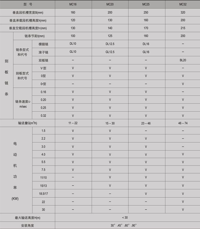 MC型埋刮板輸送機主要參數